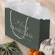 Mit dieser personalisierten Weihnachtsgeschenktasche aus der Moody Botanical Holiday Collection von Redwood & Vine Design Co. verwöhnen Sie Ihre Geschenke zeitlos. Das Design zeichnet sich durch einen reichen, tiefen grünen Hintergrund mit elegantem Urlaubsskript und Raum aus, um sich mit Ihrem Familiennamen oder Ihrer Botschaft individuell zu gestalten. Diese haltbare und wiederverwendbare Tasche eignet sich perfekt für Weihnachtsgeschenke, saisonale Party oder festliche Verpackungen und bietet eine raffinierte Touch für Ihre Feierlichkeiten.