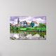Malerei von traditionellen Holzhäusern, Kanal und Schwan in Marken, Niederlande. Blick auf Kanal, Brücke und traditionelle Fischerhäuser im Wasserland Dorf. Traditionelle Holland-Symbole.