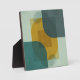 A modern, abstract geometric poster design featuring overlapping translucent shapes. The composition is divided into four quadrants with textured, muted background colors (soft teal, light sage, dark charcoal/slate). Central to the design are a large, vibrant mustard yellow curved shape and several partially visible, translucent teal/grey circles and rectangles. The artwork is characterized by its sharp lines, clean edges, and contemporary color palette, creating a sense of depth and dynamic movement through the interplay of transparency and opaque forms.