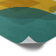 A modern, abstract geometric poster design featuring overlapping translucent shapes. The composition is divided into four quadrants with textured, muted background colors (soft teal, light sage, dark charcoal/slate). Central to the design are a large, vibrant mustard yellow curved shape and several partially visible, translucent teal/grey circles and rectangles. The artwork is characterized by its sharp lines, clean edges, and contemporary color palette, creating a sense of depth and dynamic movement through the interplay of transparency and opaque forms.