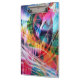 A vibrant explosion of colors and dynamic lines creates an abstract composition full of energy and movement. The interplay of bright hues and sharp angles draws the eye in various directions, creating a sense of depth and complexity.