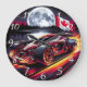 Ein schlichtes frisierte Auto ragt mit Flammen und radelt auf einer dunklen Straße an einem ruhigen See, beleuchtet vom Vollmond und begleitet von einer kanadischen Fahne.