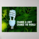 Earth Day Poster mit einer kompakten Leuchtstofflampe und der Phrase "Ändern Sie ein Licht, ändern Sie die Welt". Teilen Sie Ihre Botschaft mit unseren Poster & Geschenken des Earth Day zum Schutz der Erde.