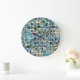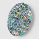 Diese Uhr mit weißen Zecken ist aus einem einzigartigen Mosaik-Quadrat-Fliesen-Muster mit Aqua, Cyan, Türkis und anderen coolen blauen Farbtönen mit einem Sprinkling von warmen Erdtönen in einer zufälligen Anordnung.