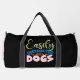 This fun black duffle bag features the playful and relatable phrase "Easily DISTRACTED BY DOGS." The vibrant yellow, blue, and pink distressed text adds a lively touch. Perfect for dog lovers who often find their attention drawn to furry friends! Edit color of the bag caps and body in the Design tool to your favored colors.