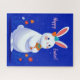 Colorful white Easter bunny with a bow, holding an egg on a blue field with spring flowers