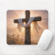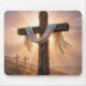 A central wooden cross, covered with a white cloth and illuminated by the warm glow of the setting sun, stands out against two additional crosses on a rocky hillside in the background