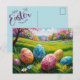 This Easter postcard was designed with an artistic feel. The eggs are made to look like paper quilling and the colors are pastel. The background is a lush meadow popping with Spring colors and blooms. The back of the postcard has a powder blue background with a "Happy Easter" graphic in script typography. There is still room to write a personal greeting. The back of the card also features address lines and stamp box in matching color.