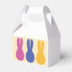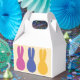 Easter favor boxes in pastel yellow with easter eggs on front and back.