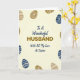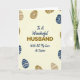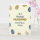 This card features a romantic Easter message centered on a soft cream background, with the words “To A Wonderful HUSBAND” set large in dark lettering. Just below, “With All My Love At Easter” appears in a smaller line, neatly aligned under the main phrase to feel like a tender add-on. Around the edges, a border of decorated egg shapes creates a gentle frame, like a quiet celebration surrounding the couple’s words 🌷. Some eggs are deep blue with white stars and curved stripes, adding a calm, night-sky contrast to the warm center. Others are golden-brown with fine white lace-like details and zigzag patterns, suggesting careful attention and a steady, affectionate bond 🐇. The layout keeps the text as the focal point while the patterned eggs guide your eye around the perimeter. White star accents and thin stripe details stand out crisply against the blue eggs near the corners.