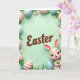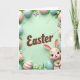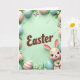This greeting card features the word “Easter” in warm brown lettering centered on a mint green background, set within a lightly raised rectangular panel that draws the eye. Around it, a decorative border of spring motifs wraps the scene like a gentle frame, with pastel egg shapes in soft sky blue and pale pink. Each egg shows a different pattern—thin stripes, small dots, and tiny floral accents—adding variety without feeling busy. From the lower right corner, a cute rabbit character 🐰 peeks in with wide eyes and rosy cheeks, holding a small bouquet of green blossoms as if offering it to a close friend. Green leaves and white daisies with yellow centers are tucked between the eggs, giving the border a garden-like look. Near the top, a couple of pink-winged butterflies drift across 🌷, while faint embossed swirls and wispy textures sit quietly in the mint background. The “Easter” text sits centered inside the raised panel, with the rabbit and bouquet angled inward from the bottom right.