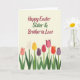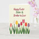 This greeting card features a soft, creamy beige background with a spring garden border that frames a family-focused Easter message. Across the upper area, the text reads “Happy Easter Sister & Brother in Law,” arranged in a flowing, calligraphic lettering style. “Happy Easter” and “Brother in Law” appear in deep burgundy, while “Sister &” is set in emerald green, creating a tender, balanced contrast that feels like two loved ones meeting in the middle. The wording sits centered with generous open space around it, keeping the layout airy and easy to read 🌷. Along the lower third, a neat row of seven stylized flowers stands like a small bouquet lined up for a shared photo, each bloom angled slightly as if leaning toward its neighbors 🐰. The petals move through ivory, daffodil yellow, blush peach, fuchsia, red-orange with a golden stripe, deep plum, and light lavender, with subtle shading that adds depth without heavy detail. Each flower is held by a slim green stem rising from sharp, elongated leaves clustered at the base.