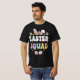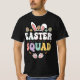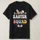 This vibrant and nostalgic design features the words "EASTER SQUAD" in a bold, bubbly retro-style font. Each letter is filled with unique pastel patterns including mint green, soft pink, peach, and yellow, creating a playful aesthetic. The top of the design is adorned with white bunny ears featuring pink centers, while the bottom showcases two cute bunny paws and tiny carrots. Decorated with patterned Easter eggs, colorful flowers, and confetti sprinkles against a dark background, this graphic is a fun and festive celebration of the spring holiday.