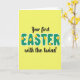 The front design shows a soft lemon-yellow background with a faint repeating grid that gives the surface a gentle texture, setting a cozy spring scene 🌷. Centered in the middle, the large word “EASTER” sits like the main banner, drawn in rounded letters filled with a forest-green plaid pattern and edged with a thin white outline. Tucked into the curves and tops of several letters are small golden egg shapes, each decorated with delicate white markings, like little keepsakes shared between close family members 🐰. Above the big word, “Your first” appears in a flowing black style, arcing lightly as if leaning in for a tender aside. Below, “with the twins!” is written in the same black lettering, placed neatly under the main word to complete the announcement. The spacing around the text feels balanced and close-knit, as though the lines are gathered together in a warm group hug. The eggs are scattered across the lettering at different heights, with white patterns that look like tiny dots and curls against the gold.