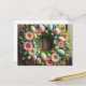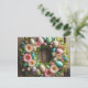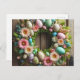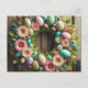 Beautiful and detailed wreath with realistic-looking pink and white flowers, lush green leaves, and assorted pastel speckled eggs.