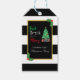 Eat, drink and be merry holiday party featuring a Christmas tree and gifts against a gold frame. Black and white striped background with holly