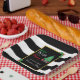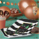 Eat, drink and be merry holiday party featuring a Christmas tree and gifts against a gold frame. Black and white striped background with holly