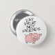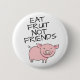 In lovely vegan round button featuring a cute pink cartoon piglet with the caption Eat fruit not friends in black handwritten machen.