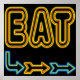 EAT Retrokunst basierend auf einem Vintagen neonischen Restaurantschild. Die Buchstaben sind gelb und rot, die Pfeile blau, rot und gelb. Spaß, trendige Werbekunst für Leute, die kochen oder essen.