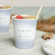 Dieses schicke Hochzeitspapier-Tasse-Design an der Küste passt zu unserer Ebb Tide-Kollektion, mit schieren Aquarellwaschbecken aus staubfreiem Perwinkelblau am oberen und unteren Ende, mit Ihrem eigenen Text in weichem Grau-Schrift.