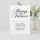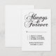 Die trendige und einzigartige Always and Forever Wedding Response Card mit einer schönen handgeschriebenen Typografie-Textgestaltung in Schwarz und Weiß. Diese einfache und elegante RSVP-Karte Set den Ton für eine klassische und romantische Hochzeit und lässt sich leicht mit Ihren Hochzeitsdetails anpassen. Klicken Sie auf "Anpassen", um weitere Personalisierungsoptionen zu erhalten. Die Hintergrundfarbe kann beliebig geändert werden.