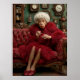 Treten Sie ein in eine Welt des zeitlosen Charmes und der sonderbaren Raffinesse mit diesem detailreichen Porträt einer älteren Frau, die in extravaganter Romantik gekleidet ist. Sie sitzt regelmäßig auf einem verzierten Vintagen Sofa und strahlt Poise und Mysterium aus, ihren Ausdruck sowohl befehlend als auch kontemplativ. Ihr voluminöser, roter Federmantel, perfekt abgestimmter Lippenstift und die Schuhe werden von ihren fein gestylten weißen Stoffwürfeln und den tief Vintagen Farbtönen des Raumes um sie herum ergänzt. Die üppige Gestaltung und die antike Dekoration - Uhren, Laternen und gerahmte Kuriositäten - schaffen ein gotisches und gleichzeitig skurriles Ambiente. Dieses Bild zeigt die Schönheit des Alterns mit Flair und exzentrischer Grazie und bietet eine visuelle Erzählung über Charakter, Geschichte und unentschuldbaren Stil. Ideal für diejenigen, die Vintage Ästhetik, maximalistische Mode und Geschichten Liebe haben. Ideal für Drucke, Grußkarten oder sonderbare Wohngestaltung.