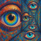 "Echoes in the Iris" - Ein surreales Portrait. Ein gewagtes, stilisiertes, impasto gemaltes Auge vervielfacht sich endlos in einem Tunnel Spiegelreflexion, dessen Farben zwischen Feuer und Wasser tanzen. Jedes Echo geht in die Ferne zurück und symbolisiert die allmähliche Verschiebung der Identität im Laufe der Zeit. Das Stück verbindet malerische Intensität mit surrealer Wiederholung und erforscht die Schönheit und Unbehagen endloser Selbstprüfung.