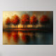 Echoes of Emberlight captures a fleeting moment where nature holds its breath. Five autumnal trees, ablaze in crimson and amber, stand sentinel along a still body of water, their reflections rippling like memory. The sky glows with a gradient of warmth fading into dusk, while a small flock of birds arcs across the horizon—motion against stillness, life against silence. The composition balances symmetry and spontaneity, with the mirrored waterline acting as both anchor and echo. This piece evokes the quiet drama of seasonal change, inviting viewers to linger in its contemplative calm and feel the hush between heartbeats.