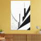 Vertical and diagonal black-and-white lines rise from a textured cosmic background, suggesting an abstract city in ascent. A fusion of minimalism and urban energy.
