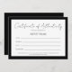 Editierbares Zertifikat der Authentizitätsvorlage, das Sie mit Ihrem Künstler oder Firmennamen und Details anpassen können. Fügen Sie Ihr Kunstwerk-Bild auf der Rückseite der Karte hinzu. Elegantes, klassisches und minimalistisches Schwarz-Weiß-Design, das viele Branding-Stile ergänzt. Druckbare downloadbare Datei und/oder benutzerdefinierte gedruckte Zertifikate in verschiedenen Ausführungen.