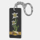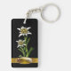Hübscher europäischer inspirierter Schlüsselanhänger in Schwarz, mit Kunstwerken zweier Edelweiss-Alpen-Blume. Eine goldene Band, ganz unten, hat einen dekorativen Textbereich, mit eigenem schwarzem Text, der für die Personalisierung bereit ist.