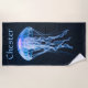 This beautiful beach towel features a blue jellyfish and an editable name at the top. You can change the name as well as the font size, style and colour.