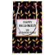 Eine Geschenktüte mit bearbeitbaren Grunge-Briefen mit dem Text 'Happy Halloween' und Platz für deinen Namen oder deine Nachricht darunter, auf einem bunten Muster von Halloween-Bonbons in Gelb und Orange.