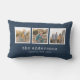 Pillow mit 3 quadratischen Fotos mit einer weißen Grenze um sie vereinbarte nebeneinander auf der vorderen und Rückseite, die es 6 Fotos in der Summe macht, die Sie durch Sie ersetzen können, Fotos gegen eine editable Hintergrundfarbe zu besitzen (Klicken "fertigt" zur Änderungshintergrundfarbe besonders an). Sie können Ihren Familiennamen in einem stilvollen Schreibmaschinen-Schriftart und das Jahr, die auch addieren hergestellt werden. Vervollkommnen Sie für Wohngestaltung, Jungvermählten, Familienandenken, etc.