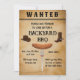 This western-style invitation features a wanted sign with a cowboy hat, cowboy boots on the sides and a fork with a sausage at the bottom. The information about the event is in the centre against an aged brown background. On the back is a field for additional information. The text on both sides is editable so go ahead and change the details as well as the font style, size and colour. This invitation can be used for neighbourhood/ family get-togethers, birthdays, anniversaries etc.