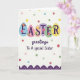This card features the word “EASTER” across the top, with each letter set inside its own egg-shaped oval, creating a cheerful banner that feels like it’s meant to be shared 🐰. The eggs are colored in a mix of sky blue, soft pink, beige, light lavender, leafy green, and sunny yellow, and the letters are printed in dark purple. Small flower shapes in red, pink, and yellow decorate a few of the egg panels, adding a gentle springtime touch that suggests a caring bond. Below the eggs, a flowing cursive line reads “greetings To A special Sister,” placed centrally and written in a darker ink that stands out clearly against the background. The white backdrop is sprinkled with confetti-like polka dots in assorted colors, including deeper reds and greens along with softer blues and pinks, giving the scene a friendly, celebratory look 🐇. A scalloped border runs along the bottom in rich purple, trimmed with tiny white dot accents that echo the scattered spots above. The lower edge is anchored by that purple scalloped trim, with evenly spaced white dots following each curve.