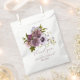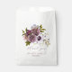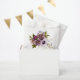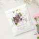 Stilvolle und elegante Hochzeitsfavoriten mit kalligrafischem Schriftart und herrlichem Blumenstrauß. Farbtöne von lila und Eggpflanze mit moosgrünem Blattwerk.