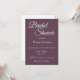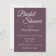 Einfache Stil, Brautduscheinladung mit einem angesagten Auberginenfarbenhintergrund, dem Namen und dem Veranstaltungsort der zukünftigen Braut, dem Party, dem Kontakt usw., in weißer, stilisierter Schrift gedruckt. Personalisieren Sie Ihre Einladung, indem Sie Text durch eigene Brautparty-Informationen ersetzen. Wählen Sie Ihre Einladung Papier Stil und Quantität.