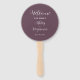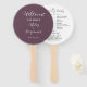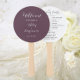 Hochzeitstag-Programm gedruckt auf einem runden Handventilator, der einen trendigen, eggpflanzenfarbenen Hintergrund auf der Vorderseite mit den Braut- und Bräutigamen in weißem, stilisiertem Skript aufweist. Auf der Rückseite des Programms sind die Teilnehmer der Hochzeitsfeier und die Zeremonie-Rites auf weißem Hintergrund mit dunkelgrauer Schrift aufgeführt. Bearbeiten Sie den Handventilator und ersetzen Sie die Informationen zum Hochzeitsprogramm durch Ihre eigenen. Ideal für eine Hochzeitsfeier im Innen- oder Außenbereich! Wählen Sie die gewünschte Anzahl von Hand-Lüfterprogrammen aus.