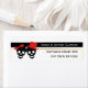Skull Paar und schwarz, weiße Streifen rot Halloween Hochzeitslabel. Dieses lustige Design zeigt zwei Schädel und Ihre Namen auf einem schwarzen Streifen mit einem goldenen Akzent. Die Braut trägt einen roten Bogen und die Bärenmütze einen Hut.