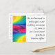 Der Wendepunkt in der Geschichte schafft die perfekte Gelegenheit, ein mutiger Aktivist zu werden. Woll, deine Freunde und Familie zu ermutigen, sich mit dir für die Gleichberechtigung der Ehen einzusetzen? Auf der Vorderseite ist diese Postkarte dazu gedacht, die Frustration von gleichgeschlechtlichen Paaren auszudrücken, die in den USA rechtlich verheiratet werden, aber nicht aufgrund unserer Regierung. Auf der Rückseite gibt es Informationen, wie man Bundesstaatliche Regierungsvertreter kontaktieren kann, um gleiche Menschenrechte für alle US-Bürger zu fordern.