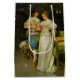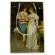 Dieses Design zeigt ein Gemälde des italienischen Künstlers Federico Andreotti (1847-1930). Es zeigt ein elegant gekleidetes Ehepaar nach der Hochzeitsfeier: nach den Freuden der jungen Liebe setzen sie sich in das Glück des verheirateten Lebens ein. Die Braut trägt ein elegantes weißes Kostüm, während ihr Mann ein blau-rosa Outfit trägt. Beide Kostüme scheinen aus Seide und anderen feinen Stoffen zu bestehen. Die Dame trägt eine Perlenhalskette. Der Mann lächelt glücklich an seiner Ehefrau, während er sich auf den Arm hält. Auf dem Boden steht eine rosa Rose, die während der Zeremonie geworfen worden sein könnte.