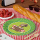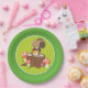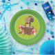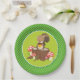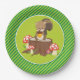 Diese Geburtstags-Partyplatte kennzeichnet ein niedliches clipart Braun und ein tan Eichhörnchen, die auf einem Baumstumpf sitzt, der durch drei rot und weiße Pilze umgeben wird. Der Hintergrund der Platte ist in der Mitte mit koordinierenc$zweiton grünen Streifen auf der Kante der Partyplatte grün.