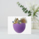 Ein Eichhörnchen sitzt in einer lila Eierschale, die eine kleine blaue Blume hält. Senden Sie diese Frühlingspostkarte dieses Ostern aus.