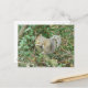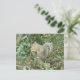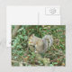 Diese niedliche Postkarte zeigt ein Foto eines niedlichen, flauschigen grauen Eichhörnchens, das eine Eichel klopft und im Wald in einem Baum sitzt.