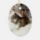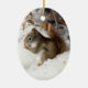 Ein kleines Eichhörnchen macht eine Mahlzeit im Schnee.
