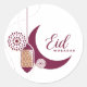 Eid Mubarak Gruß islamisches Aufkleber Design mit einzigartigen Laterne, Mond und islamischen Ornamenten.