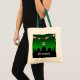 Eid Mubarak grüßt Illustration mit einer festlichen und farbenfrohen Garage in einer magischen Nachtszene mit einer Moschee Silhouette und dem Mond und den Sternen auf einem grünen Nachthimmel.
