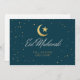 Eid Mubarak Flachgrusskarte mit goldenem Halbmond und Stern mit verstreuten kleinen Sternen.