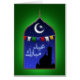 Eid Mubarak grüßt Illustration mit einer festlichen Nachtszene: eine farbenfrohe Garland, der Mond und die Sterne und eine Silhouette einer Moschee in einem arabischen Fenster auf einem grünen gemusterten Hintergrund.